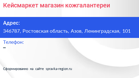 Кейсмаркет, магазин кожгалантереи по адресу 346787, Ростовская область, Азов, Ленинградская, 101 в дальнейшем Организация, размещена в следующих категориях: