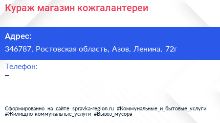 Кураж, магазин кожгалантереи по адресу 346787, Ростовская область, Азов, Ленина, 72г в дальнейшем Организация, размещена в следующих категориях: