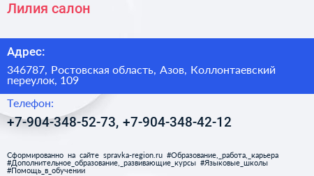 Лилия, салон по адресу 346787, Ростовская область, Азов, Коллонтаевский переулок, 109 в дальнейшем Организация, размещена в следующих категориях: