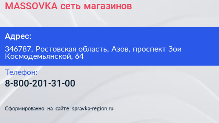 MASSOVKA, сеть магазинов по адресу 346787, Ростовская область, Азов, проспект Зои Космодемьянской, 64 в дальнейшем Организация, размещена в следующих категориях: