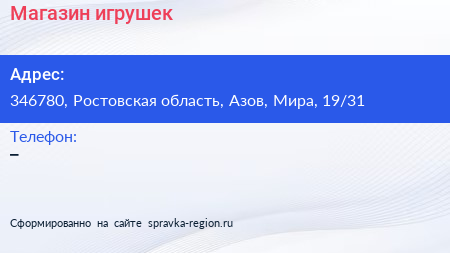 Магазин игрушек по адресу 346780, Ростовская область, Азов, Мира, 19/31 в дальнейшем Организация, размещена в следующих категориях: