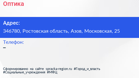 Оптика по адресу 346780, Ростовская область, Азов, Московская, 25 в дальнейшем Организация, размещена в следующих категориях: