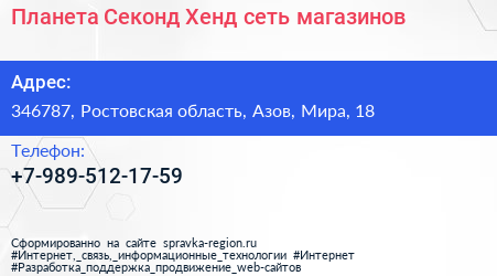 Планета Секонд Хенд, сеть магазинов по адресу 346787, Ростовская область, Азов, Мира, 18 в дальнейшем Организация, размещена в следующих категориях: