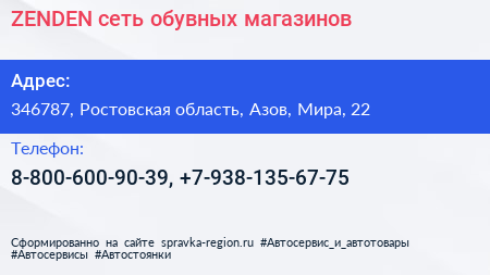 ZENDEN, сеть обувных магазинов по адресу 346787, Ростовская область, Азов, Мира, 22 в дальнейшем Организация, размещена в следующих категориях: