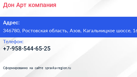 Дон-Арт, компания по адресу 346780, Ростовская область, Азов, Кагальницкое шоссе, 16 в дальнейшем Организация, размещена в следующих категориях: