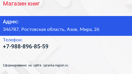 Магазин книг по адресу 346787, Ростовская область, Азов, Мира, 26 в дальнейшем Организация, размещена в следующих категориях:
