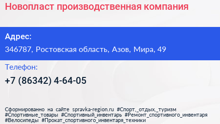 Новопласт, производственная компания по адресу 346787, Ростовская область, Азов, Мира, 49 в дальнейшем Организация, размещена в следующих категориях: