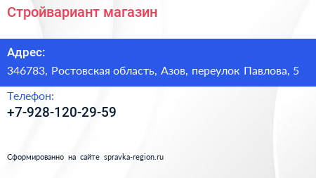 Стройвариант, магазин по адресу 346783, Ростовская область, Азов, переулок Павлова, 5 в дальнейшем Организация, размещена в следующих категориях:
