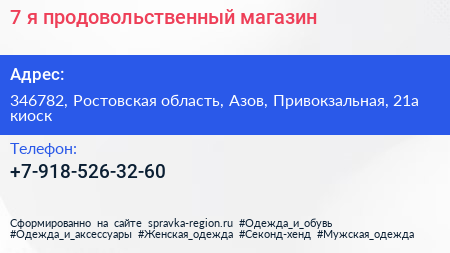 7-я, продовольственный магазин по адресу 346782, Ростовская область, Азов, Привокзальная, 21а киоск в дальнейшем Организация, размещена в следующих категориях: