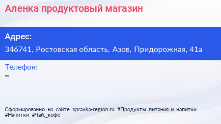 Аленка, продуктовый магазин по адресу 346741, Ростовская область, Азов, Придорожная, 41а в дальнейшем Организация, размещена в следующих категориях: