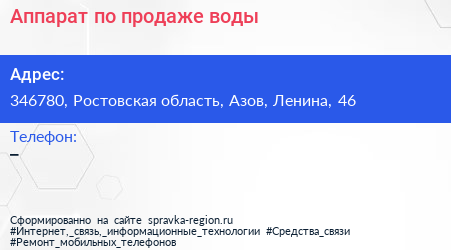 Аппарат по продаже воды по адресу 346780, Ростовская область, Азов, Ленина, 46 в дальнейшем Организация, размещена в следующих категориях: