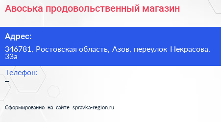 Авоська, продовольственный магазин по адресу 346781, Ростовская область, Азов, переулок Некрасова, 33а в дальнейшем Организация, размещена в следующих категориях: