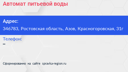 Автомат питьевой воды по адресу 346783, Ростовская область, Азов, Красногоровская, 31г в дальнейшем Организация, размещена в следующих категориях: