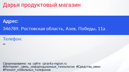 Дарья, продуктовый магазин по адресу 346789, Ростовская область, Азов, Победы, 11а в дальнейшем Организация, размещена в следующих категориях:
