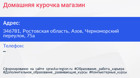 Домашняя курочка, магазин по адресу 346781, Ростовская область, Азов, Черноморский переулок, 75а в дальнейшем Организация, размещена в следующих категориях: