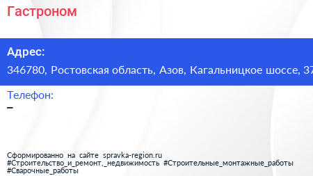Гастроном по адресу 346780, Ростовская область, Азов, Кагальницкое шоссе, 37 в дальнейшем Организация, размещена в следующих категориях: