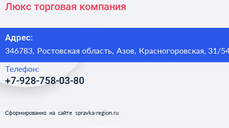 Люкс, торговая компания по адресу 346783, Ростовская область, Азов, Красногоровская, 31/54 в дальнейшем Организация, размещена в следующих категориях: