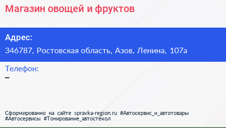 Магазин овощей и фруктов по адресу 346787, Ростовская область, Азов, Ленина, 107а в дальнейшем Организация, размещена в следующих категориях: