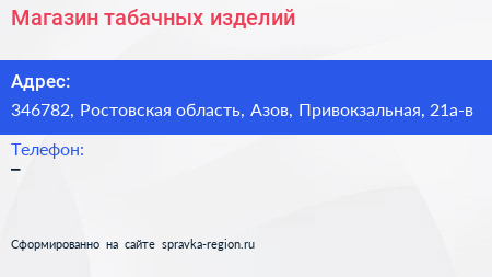Магазин табачных изделий по адресу 346782, Ростовская область, Азов, Привокзальная, 21а-в в дальнейшем Организация, размещена в следующих категориях: