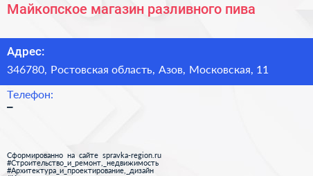 Майкопское, магазин разливного пива по адресу 346780, Ростовская область, Азов, Московская, 11 в дальнейшем Организация, размещена в следующих категориях: