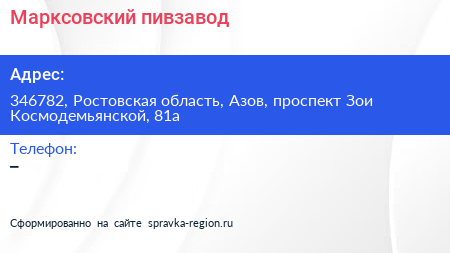 Марксовский пивзавод по адресу 346782, Ростовская область, Азов, проспект Зои Космодемьянской, 81а в дальнейшем Организация, размещена в следующих категориях:
