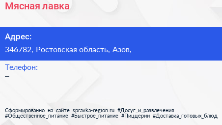 Мясная лавка по адресу 346782, Ростовская область, Азов, в дальнейшем Организация, размещена в следующих категориях: