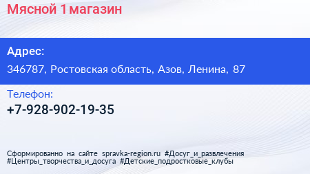 Мясной №1, магазин по адресу 346787, Ростовская область, Азов, Ленина, 87 в дальнейшем Организация, размещена в следующих категориях: