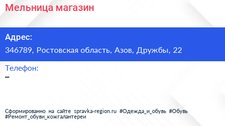 Мельница, магазин по адресу 346789, Ростовская область, Азов, Дружбы, 22 в дальнейшем Организация, размещена в следующих категориях: