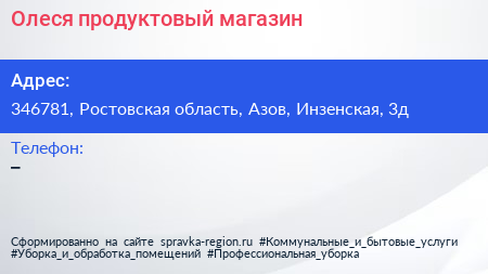 Олеся, продуктовый магазин по адресу 346781, Ростовская область, Азов, Инзенская, 3д в дальнейшем Организация, размещена в следующих категориях: