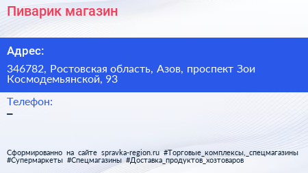 Пиварик, магазин по адресу 346782, Ростовская область, Азов, проспект Зои Космодемьянской, 93 в дальнейшем Организация, размещена в следующих категориях: