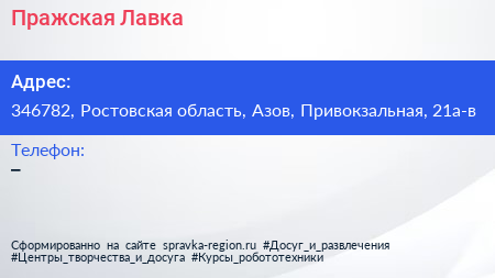Пражская Лавка по адресу 346782, Ростовская область, Азов, Привокзальная, 21а-в в дальнейшем Организация, размещена в следующих категориях: