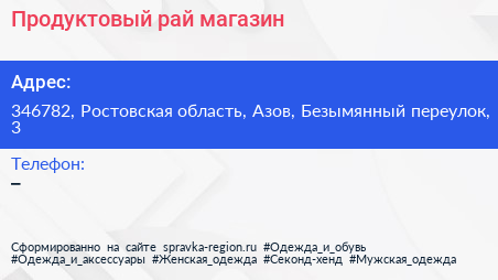 Продуктовый рай, магазин по адресу 346782, Ростовская область, Азов, Безымянный переулок, 3 в дальнейшем Организация, размещена в следующих категориях:
