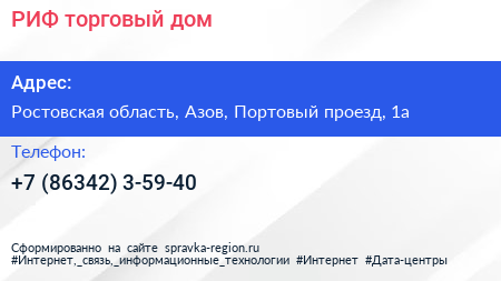 РИФ, торговый дом по адресу Ростовская область, Азов, Портовый проезд, 1а в дальнейшем Организация, размещена в следующих категориях: