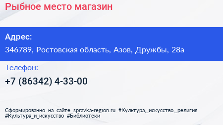 Рыбное место, магазин по адресу 346789, Ростовская область, Азов, Дружбы, 28а в дальнейшем Организация, размещена в следующих категориях: