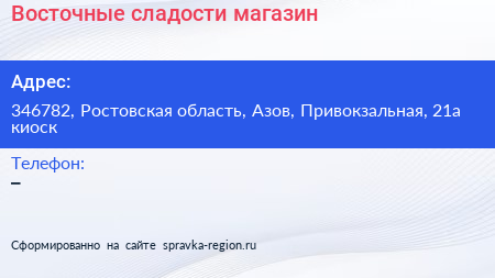 Восточные сладости, магазин по адресу 346782, Ростовская область, Азов, Привокзальная, 21а киоск в дальнейшем Организация, размещена в следующих категориях: