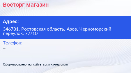 Восторг, магазин по адресу 346781, Ростовская область, Азов, Черноморский переулок, 77/10 в дальнейшем Организация, размещена в следующих категориях: