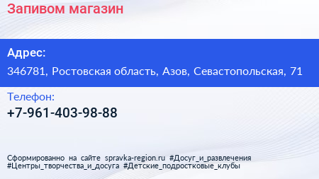 Запивом, магазин по адресу 346781, Ростовская область, Азов, Севастопольская, 71 в дальнейшем Организация, размещена в следующих категориях: