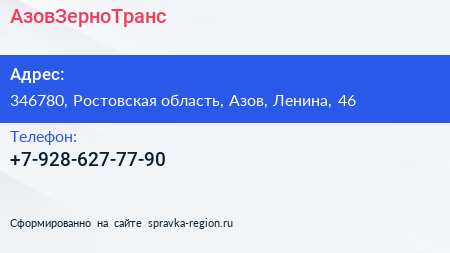 АзовЗерноТранс по адресу 346780, Ростовская область, Азов, Ленина, 46 в дальнейшем Организация, размещена в следующих категориях: