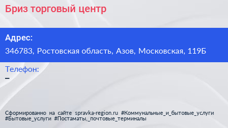 Бриз, торговый центр по адресу 346783, Ростовская область, Азов, Московская, 119Б в дальнейшем Организация, размещена в следующих категориях: