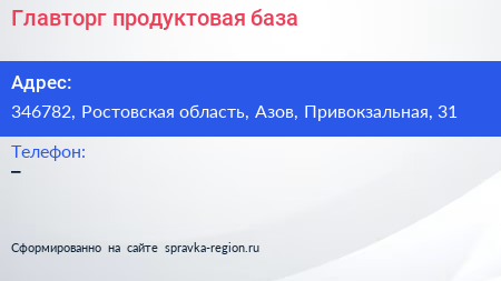 Главторг, продуктовая база по адресу 346782, Ростовская область, Азов, Привокзальная, 31 в дальнейшем Организация, размещена в следующих категориях: