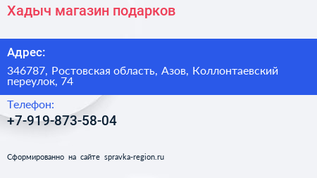 Хадыч, магазин подарков по адресу 346787, Ростовская область, Азов, Коллонтаевский переулок, 74 в дальнейшем Организация, размещена в следующих категориях: