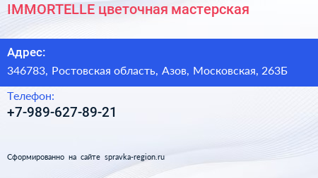 IMMORTELLE, цветочная мастерская по адресу 346783, Ростовская область, Азов, Московская, 263Б в дальнейшем Организация, размещена в следующих категориях:
