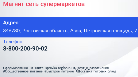 Магнит, сеть супермаркетов по адресу 346780, Ростовская область, Азов, Петровская площадь, 7 в дальнейшем Организация, размещена в следующих категориях: