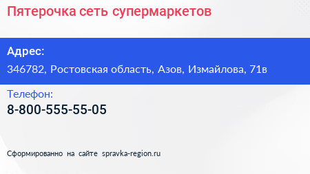 Пятерочка, сеть супермаркетов по адресу 346782, Ростовская область, Азов, Измайлова, 71в в дальнейшем Организация, размещена в следующих категориях: