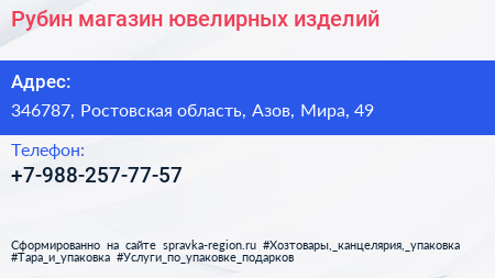 Рубин, магазин ювелирных изделий по адресу 346787, Ростовская область, Азов, Мира, 49 в дальнейшем Организация, размещена в следующих категориях: