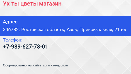 Ух ты цветы, магазин по адресу 346782, Ростовская область, Азов, Привокзальная, 21а-в в дальнейшем Организация, размещена в следующих категориях: