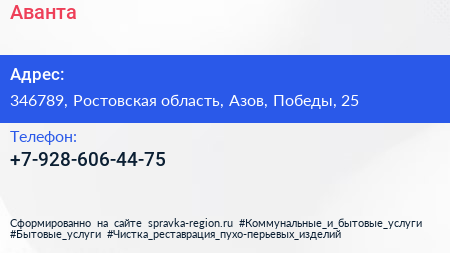 Аванта по адресу 346789, Ростовская область, Азов, Победы, 25 в дальнейшем Организация, размещена в следующих категориях: