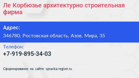 Ле Корбюзье, архитектурно-строительная фирма по адресу 346780, Ростовская область, Азов, Мира, 35 в дальнейшем Организация, размещена в следующих категориях: