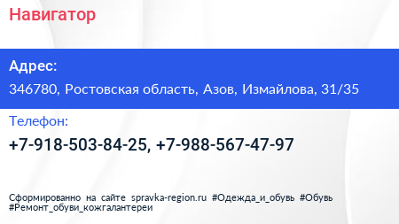 Навигатор по адресу 346780, Ростовская область, Азов, Измайлова, 31/35 в дальнейшем Организация, размещена в следующих категориях: