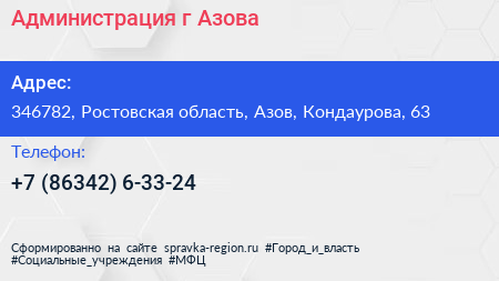 Администрация г. Азова по адресу 346782, Ростовская область, Азов, Кондаурова, 63 в дальнейшем Организация, размещена в следующих категориях: